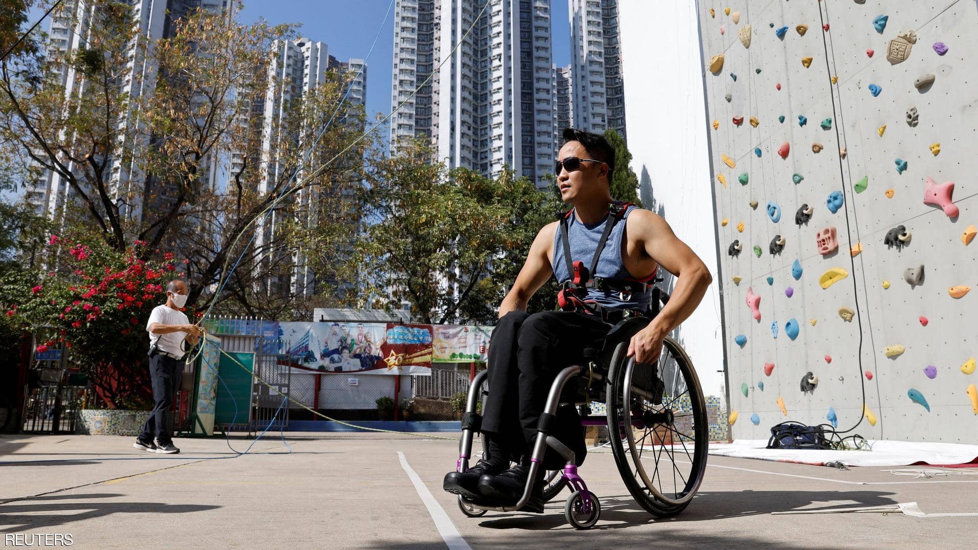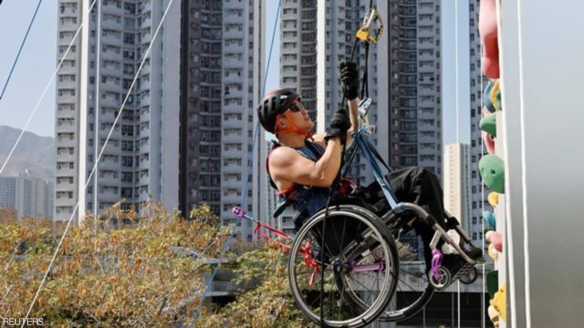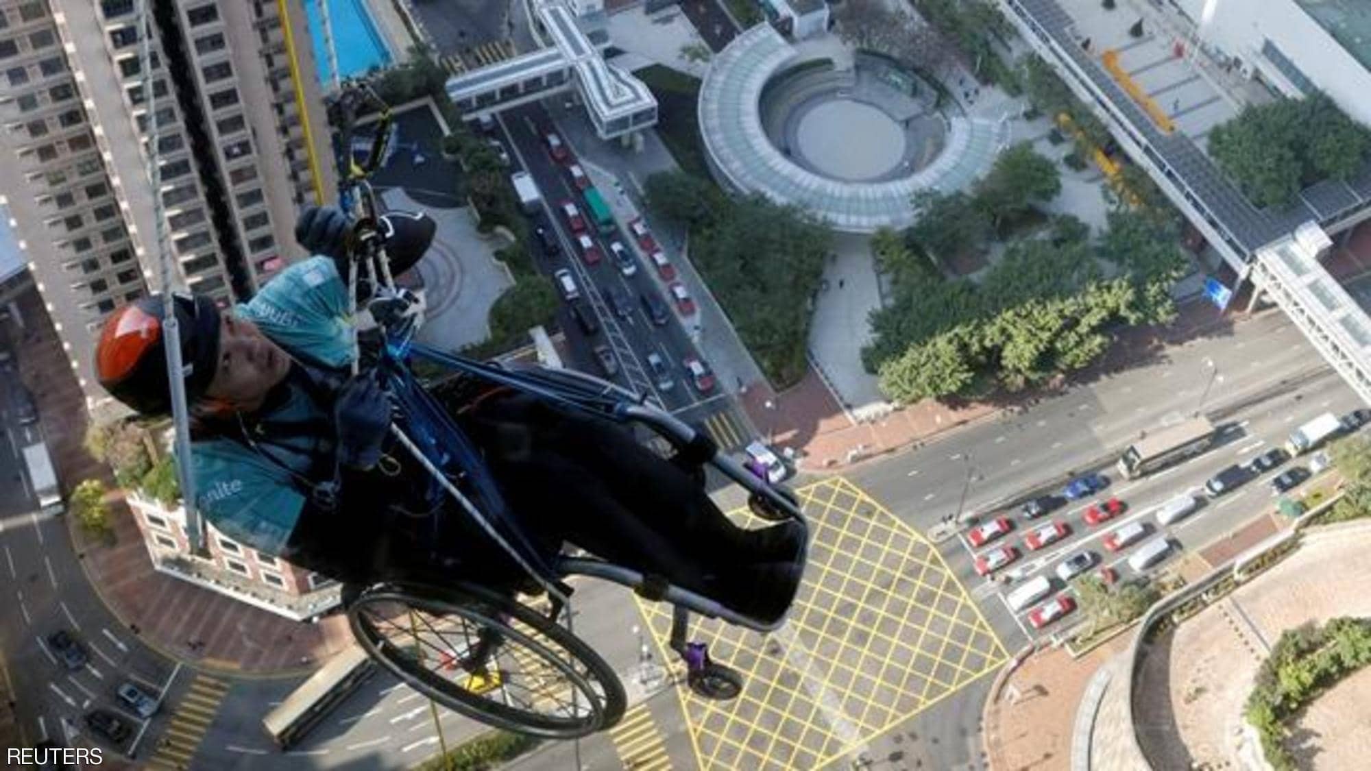 أحداث اليوم - أصبح لاي تشي واي، أول رجل في هونغ كونغ يتسلق أكثر من 250 مترا من واجهة ناطحة سحاب، وهو مربوط بكرسي متحرك.