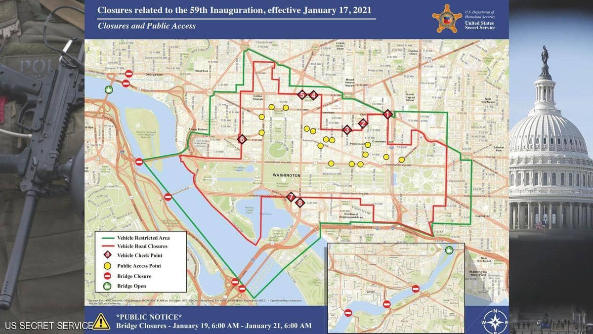 وتم تقسيم العاصمة واشنطن إلى منطقتين أمنيتين؛ الأولى هي المنطقة الحمراء حيث الدخول إليها محظور بالكامل باستثناء سيارات الشرطة والآليات العسكرية وهي تمتد من غرب البيت الأبيض إلى شرق الكونغرس ومل بينهما، فيما المنطقة الخضراء متاحة فقط للعاملين والقاطنين فيها، لكن سيرا على الأقدام.