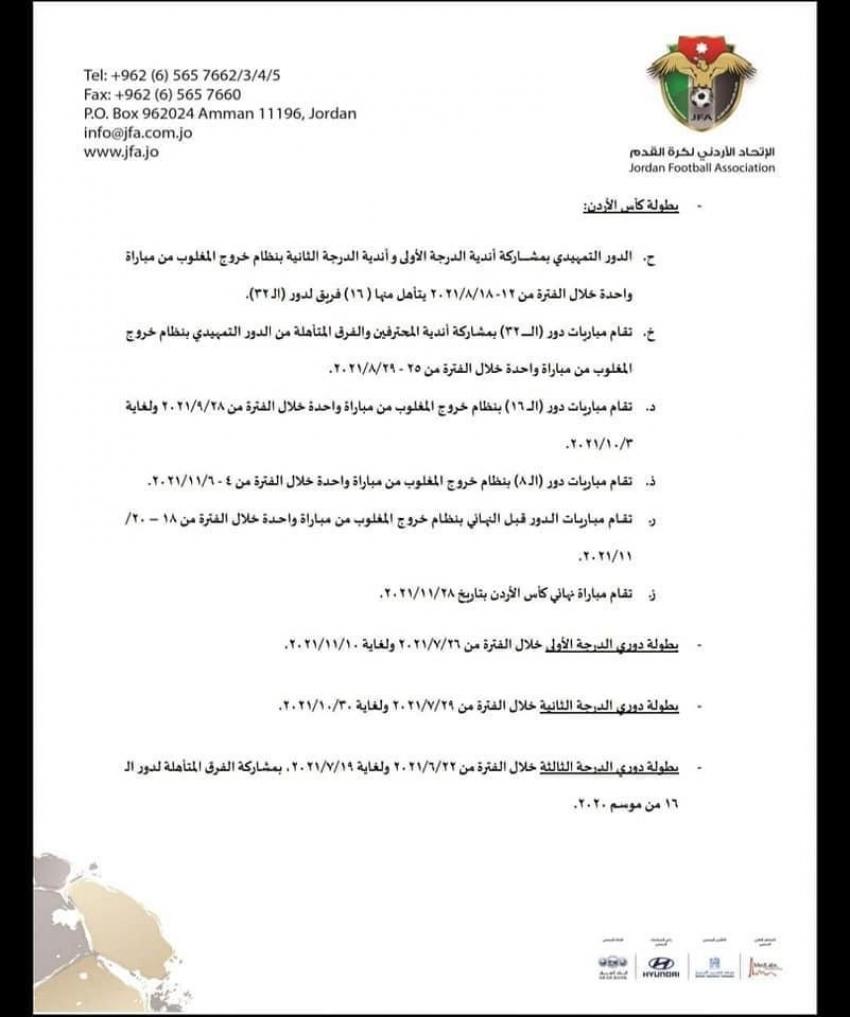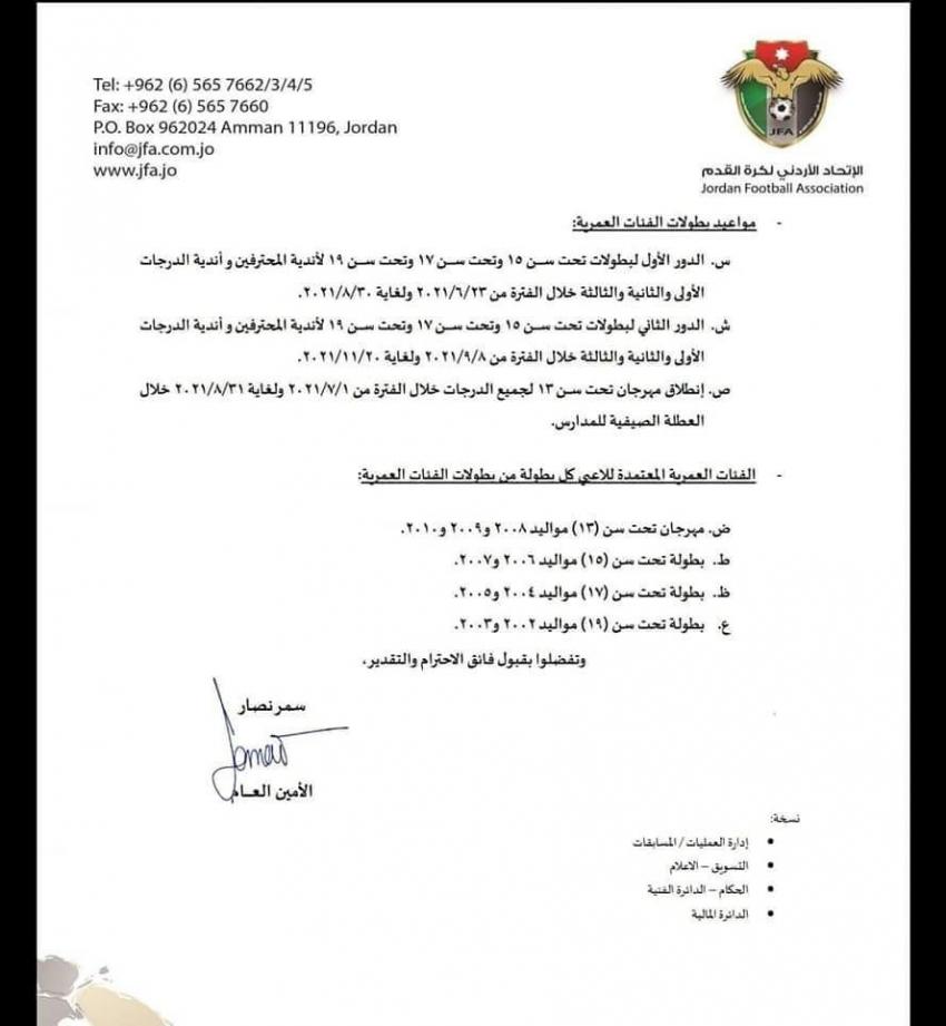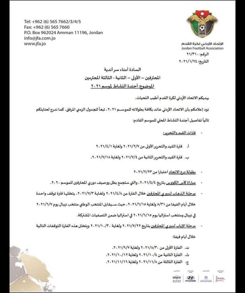 أحداث اليوم - أعلن الإتحاد الأردني لكرة القدم أجندة نشاطاته للموسم المقبل.
