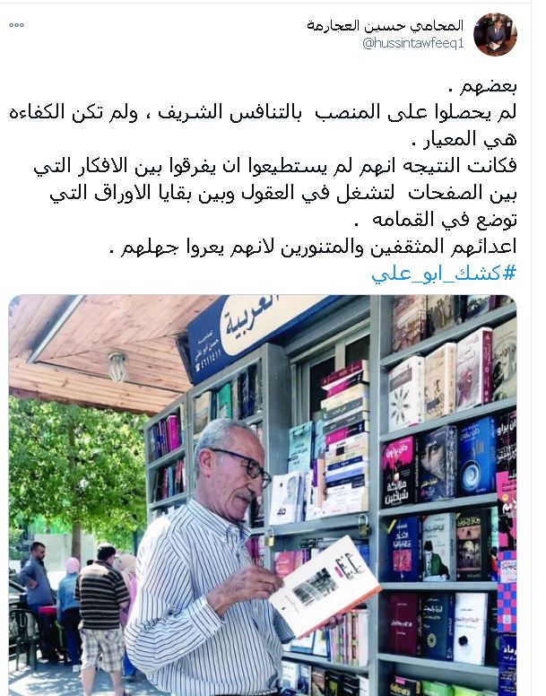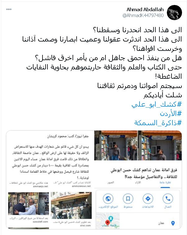 وأثار الاجراء موجة استياء عبر منصات التواصل الأردنية، حيث عبر نشطاء عن استهجانهم لمصادرة الكتب بواسطة “آلية النفايات”، مبينين بأن ذلك الإجراء “غير لائق” خصوصا وأن الكشك ومالكه المعروف بـ”أبو علي” يقوم ببيع الكتب والمجلات للأردنيين منذ عشرات السنين.