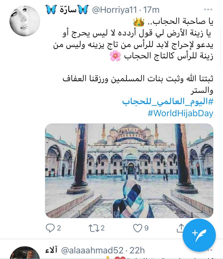أحداث اليوم - براءة شلالدة - دشنت ناشطات على مواقع التواصل الاجتماعي، وسم #يوم_الحجاب_العالمي احتفالا بهذه المناسبة التي تصادف الاول من شباط كل عام.