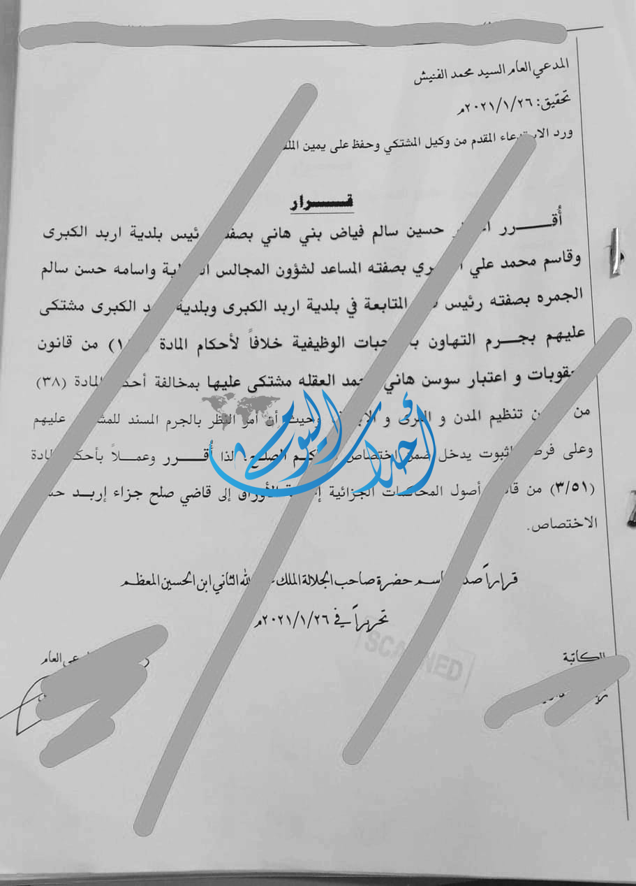 قرر مدعي عام اربد احالة رئيس بلدية اربد الكبرى وعدد من الموظفين للقضاء بجرم التهاون والاخلال بالواجبات الوظيفية على اثر شكوى تقدم بها مواطن.