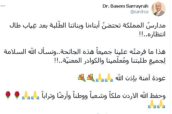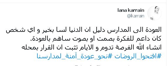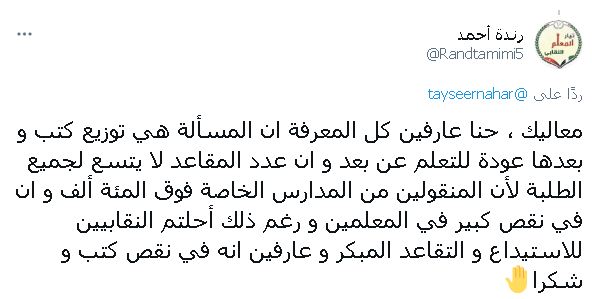 من جهتها رحبت حملة الحملة الوطنية للعودة الى المدارس "نحو عودة آمنة لمدارسنا" بعودة آمنة بعودة الطلبة في الصفوف الاساسية الأولى والثانوية العامة باعتبارها مراحل تأسيس ومصيرية للطلبة.
