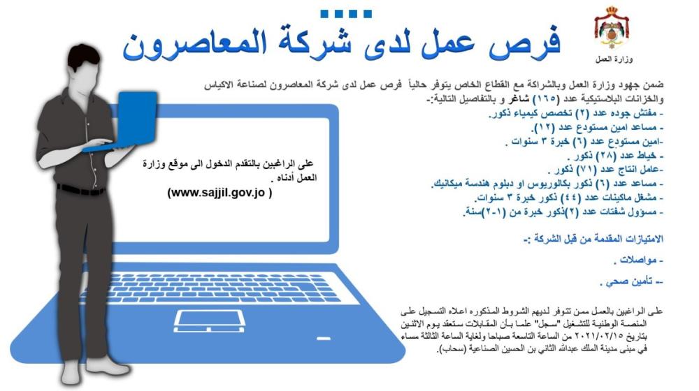 أحداث اليوم - تعلن وزارة العمل عن توافر 165 فرصة عمل للأردنيين للعمل في إحدى شركات القطاع الخاص.