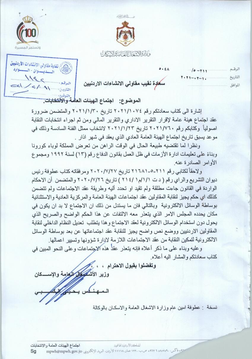 أحداث اليوم - رفضت الحكومة طلب نقابة المقاولين بعقد اجتماع هيئتها العامة وانتخابات مجلس الادارة.وقالت الحكومة في ردها على طلب النقابة إنه يتعذر اجراء الانتخابات في الوقت الحالي نظراً للوضع الوبائي وحتى اشعار آخر.