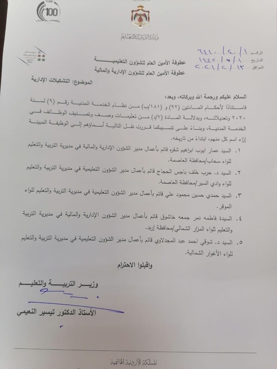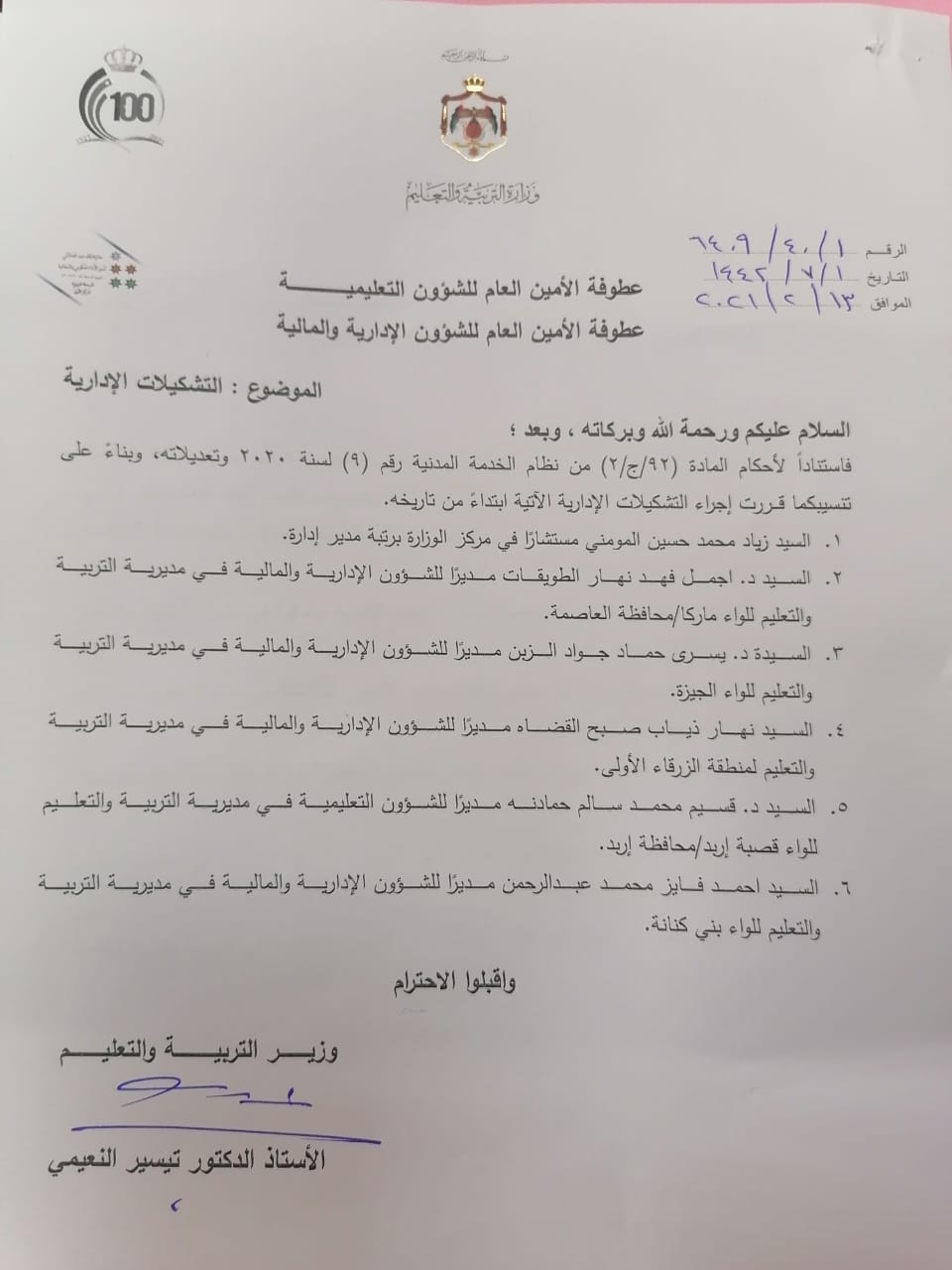 أحداث اليوم - قرَّرَ وزيرُ التربية والتَّعليم، الدّكتور تيسير النعيمي، إجراءَ التشكيلات الإدارية الآتية ابتداءً من تاريخ اليوم السبت 13/2/2021 :