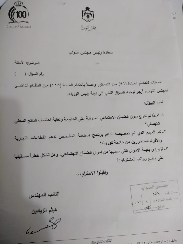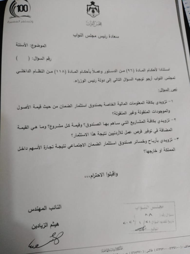 وطلب زيادين تزويده بكافة المعلومات المالية الخاصة بصندوق استثمار أموال الضمان الاجتماعي، ومشاريعه وارتباطها بتوفير فرص عمل للأردنيين.