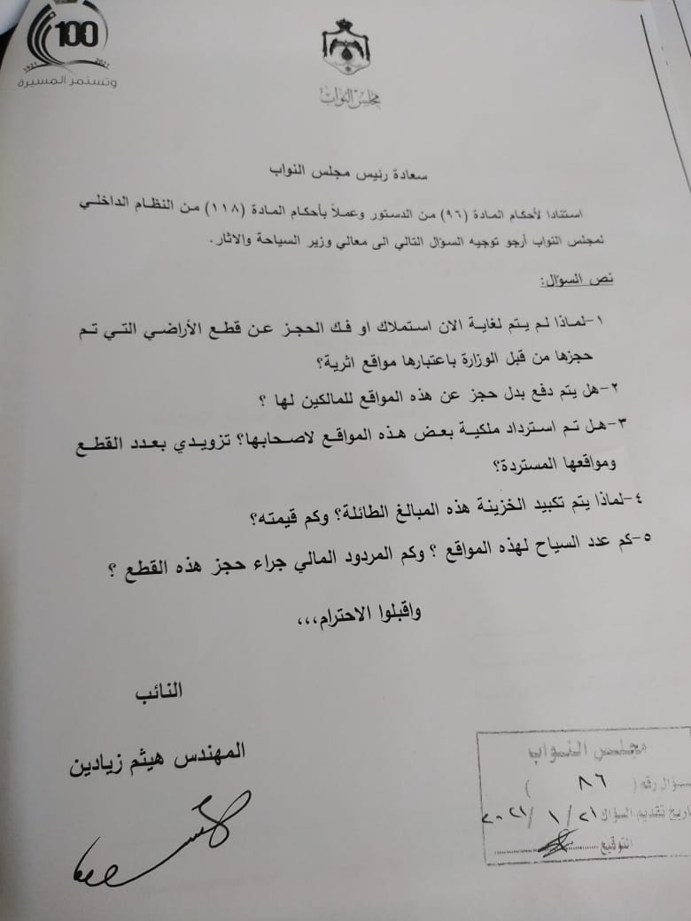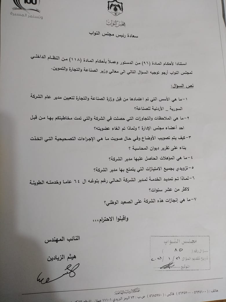 كما أورد سؤالا حول الاسس المعتمدة في تعيين مدير عام الشركة السورية – الأردنية للصناعة من قبل وزارة الصناعة والتجارة والتموين، ولماذا ألغيت عضوية أحد أعضاء مجلس الإدارة، إضافة إلى سؤاله عن ملكية إحدى الشركات المتعاقدة مع سلطة العقبة الاقتصادية الخاصة.
