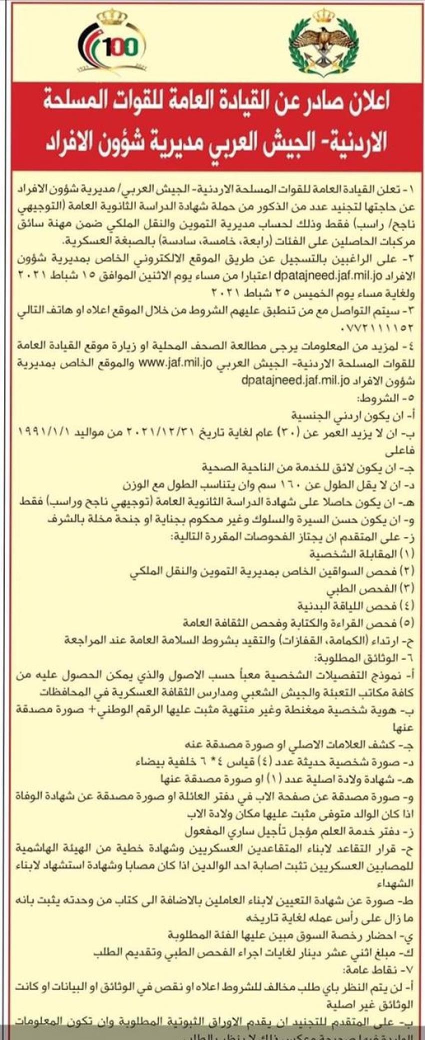 أحداث اليوم - أعلنت القيادة العامة للقوات المسلحة الأردنية - الجيش العربي عن فتح باب التجنيد لعدد من الذكور من حملة الشهادة الثانوية العامة (ناجح/راسب) فقط وذلك لحساب مديرية التموين والنقل الملكي ضمن مهنة سائق مركبات.