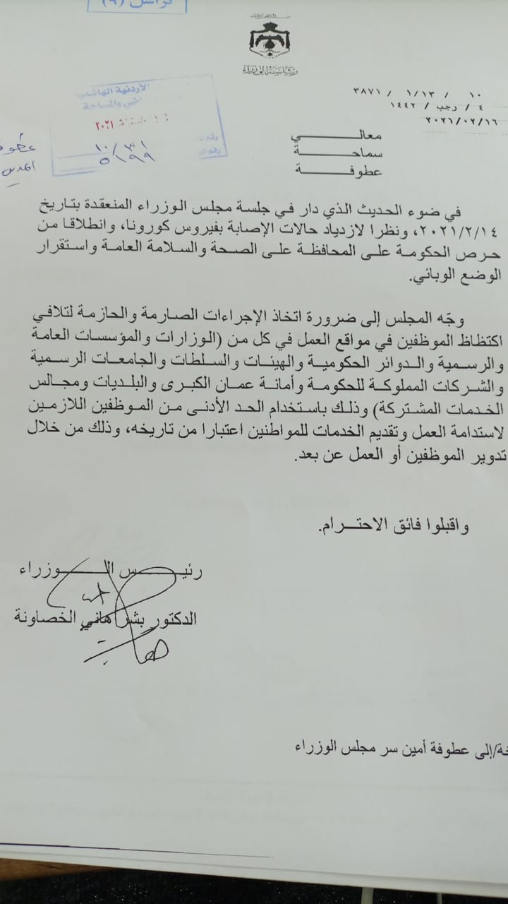 كما عمم الخصاونة بتدوير الموظفين او العمل عن بعد.