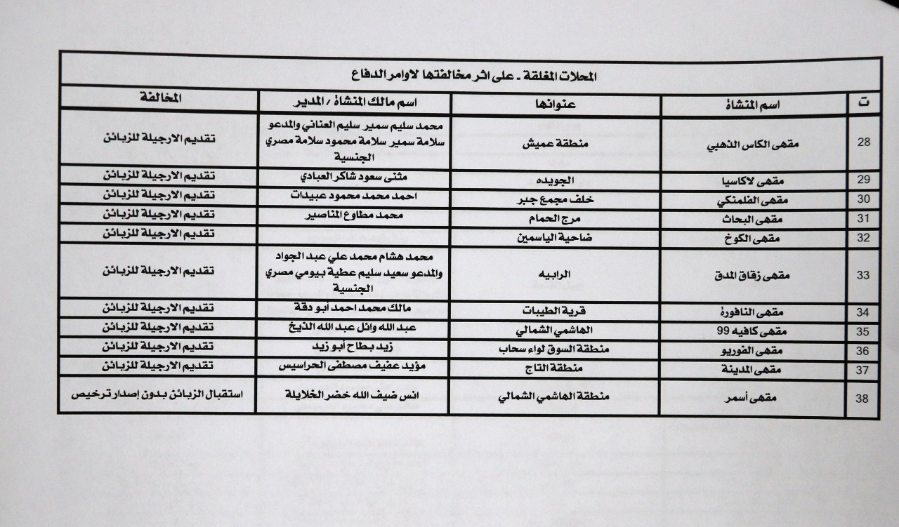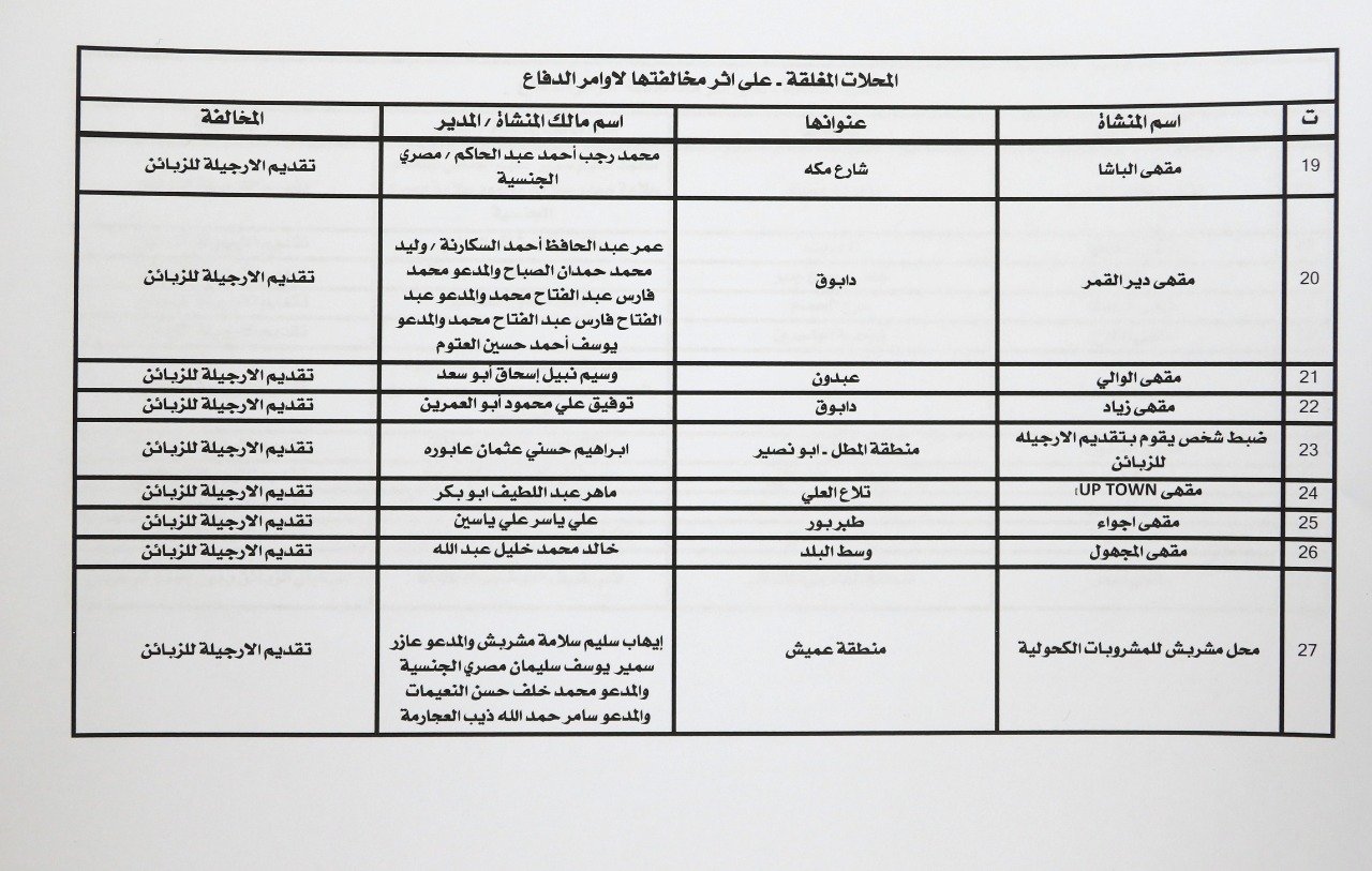 وتاليا أسماء اصحاب المقاهي والمنشآت الذين تم تسجيل مخالفات أوامر الدفاع بحقهم: