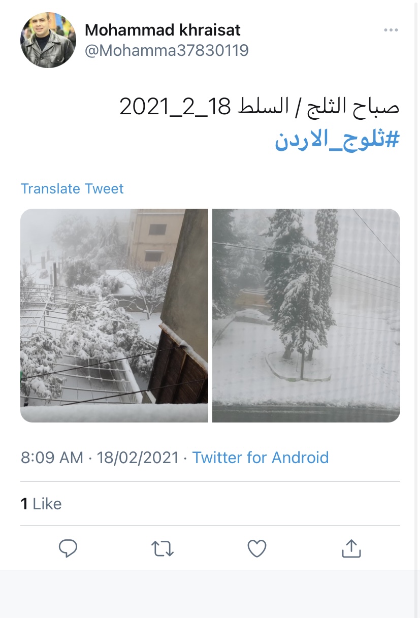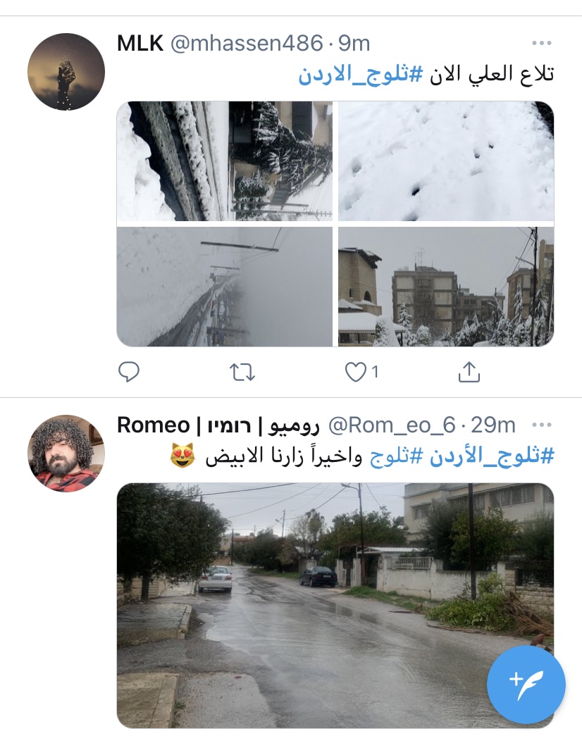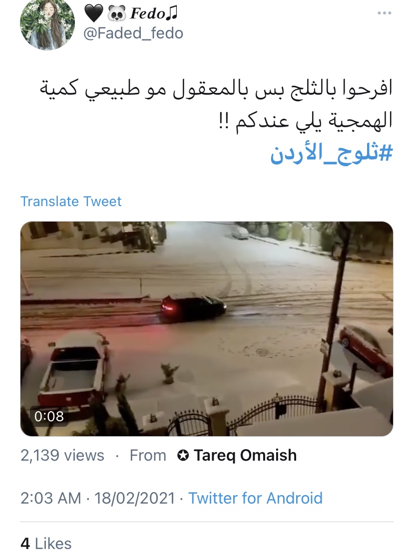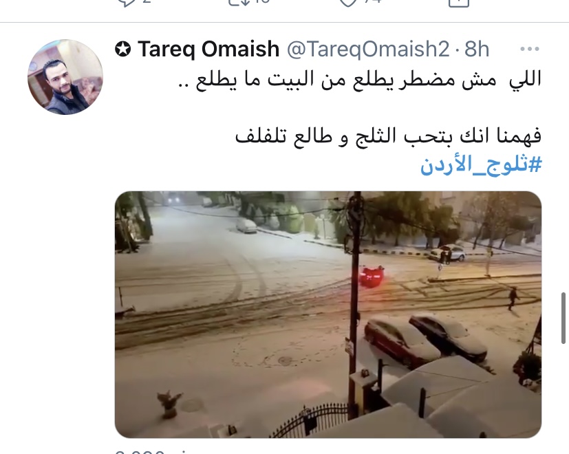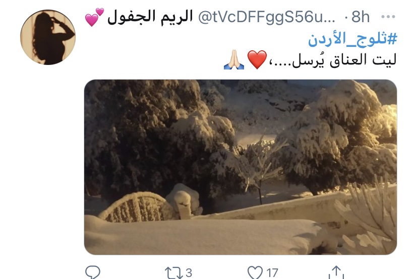 فرح غيث - تفاعل الأردنيون مع وسم #ثلوج_الأردن بعد ما حلّ الزائر الابيض على اغلب مناطق المملكة.