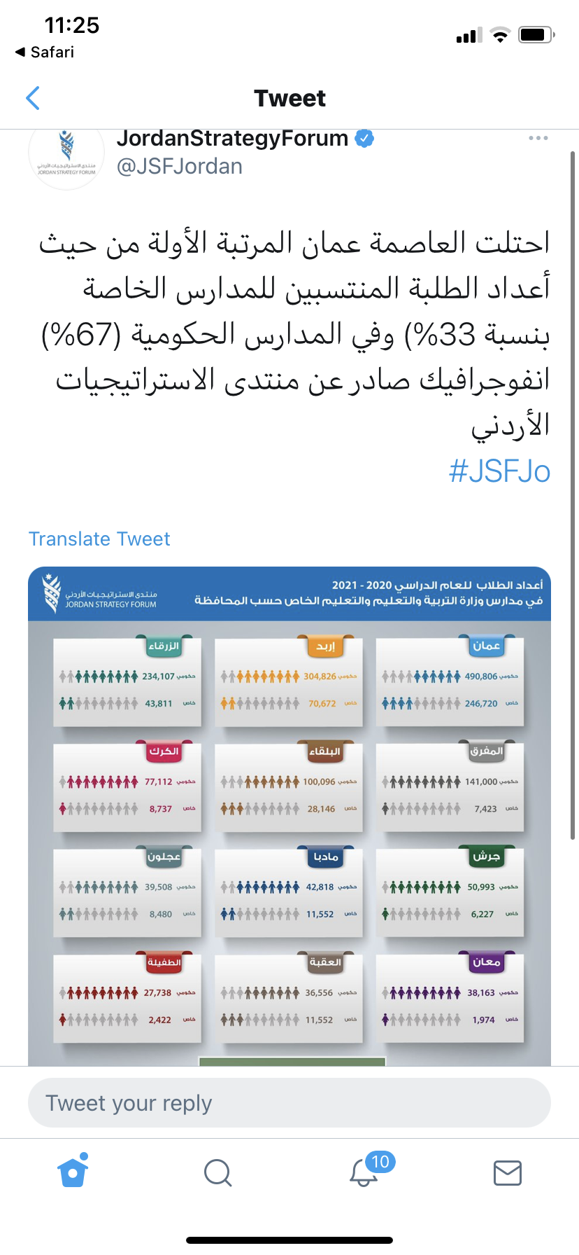 وقال المنتدى، في تغريدة له عبر منصة تويتر، إن أعداد الطلبة المنتسبين للمدارس الخاصة بلغ 33 بالمئة، بينما بلغ أعداد الطلبة في المدارس الحكومية 67%.