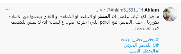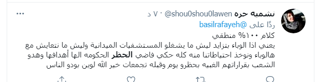 ولم تغيب روح الدعابة والنكات عن تعليقات النشطاء على مواقع التواصل الإجتماعي، تحت وسم #الحظر، مبينين أن الحظر قد يكون له فوائد لكنها لا تخص الوباء بقدر ما تخص العلاقات الاسرية.