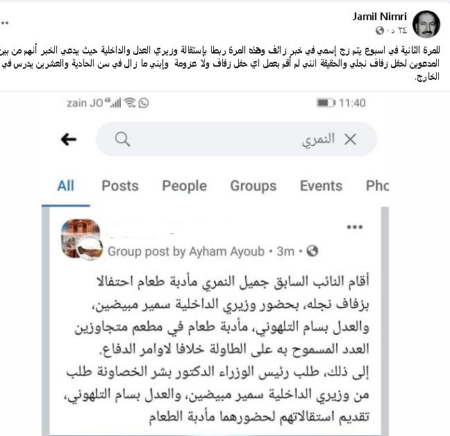 أحداث اليوم - نفى النائب السابق جميل النمري ما يتم تداوله حول حضور وزيري العدل والداخلية حفلا اقامه بمناسبة زفاف نجله، مبينا أن هذه المرة الثانية في اسبوع يزج اسمه بخبر زائف.
