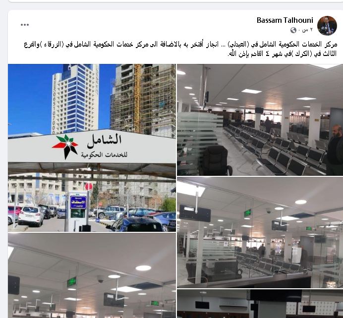 وقال التلهوني في منشور له عبر حسابه على الفيسبوك: "مركز الخدمات الحكومية الشامل في (العبدلي) .. انجاز أفتخر به بالاضافة الى مركز خدمات الحكومية الشامل في (الزرقاء )والفرع الثالث في (الكرك )في شهر 4 القادم بإذن الله".