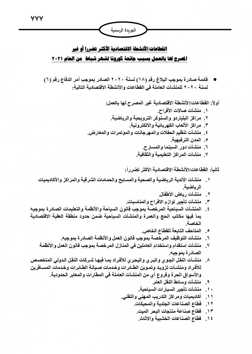 أحداث اليوم - أعلنت الحكومة، الاثنين، قائمة القطاعات الأكثر تضرراً والقطاعات المغلقة بسبب جائحة كورونا خلال شهر شباط الماضي.وتالياً القطاعات: