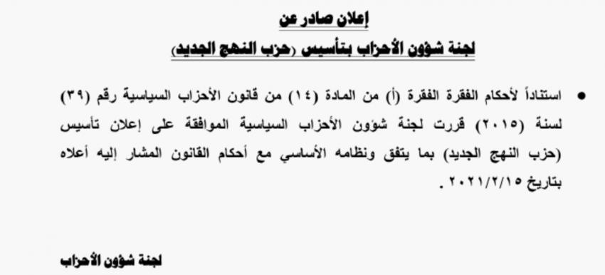 أحداث اليوم - أعلنت لجنة شؤون الاحزاب في عدد الجريدة الرسمية اليوم الاثنين، موافقتها على اعلان تأسيس حزب النهج الجديد.