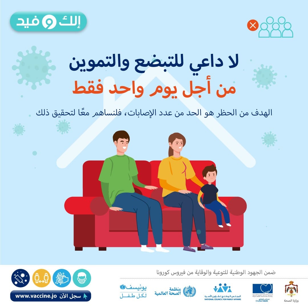 أحداث اليوم - دعت مديرية التوعية والإعلام الصحي في وزارة الصحة، الأردنيين إلى عدم التبضع والتموين لأجل يوم واحد فقط.