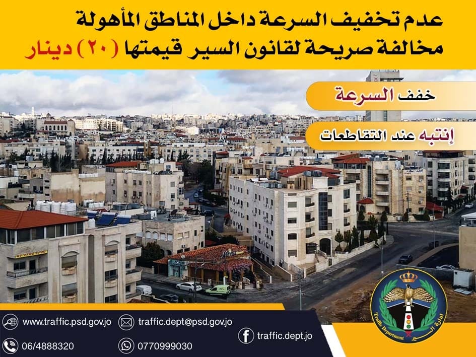 وأكدت أن عدم تخفيف السرعة في المنطق المأهولة، يعد مخالفة صريحة لقانون السير، ويغرم صاحبها بقيمة 20 دينارا.