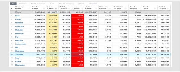 أحداث اليوم - اشار تقرير «ورد ميتر» الدولي لإحصاءات كورونا حول العالم الى أن الأردن احتل المرتبة الأولى عربياً بعدد حالات الإصابة اليومي بعدوى فيروس كورونا، حيث سجل 5.733 اصابة حتى الساعة السابعة من مساء أمس الخميس، متجاوزا بذالك الولايات المتحدة، وسجلت العراق المرتبة 13 عالمياً في هذا الإحصاء.
