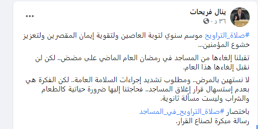 وقال فريحات في منشور له عبر فيسبوك، إن صلاة التراويح موسم سنوي لتوبة العاصين ولتقوية إيمان المقصرين ولتعزيز خشوع المؤمنين.. تقبلنا إلغاءها من المساجد في رمضان العام الماضي على مضض.. لكن لن نقبل إلغاءها هذا العام.