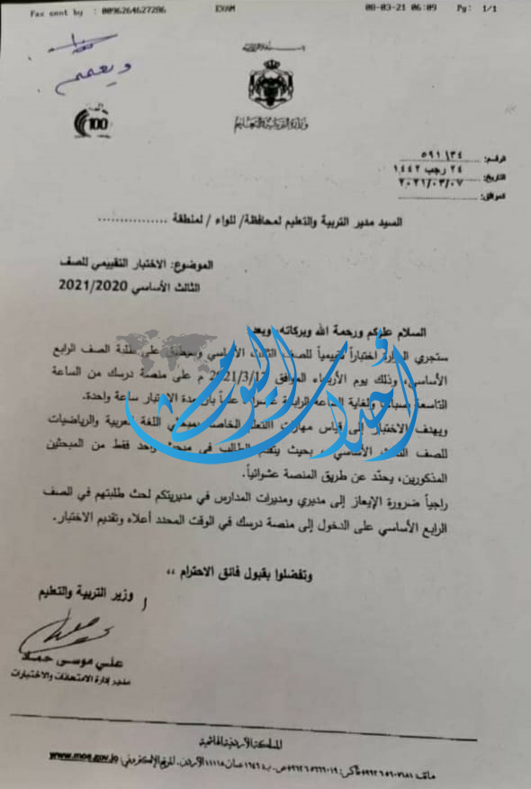 أحداث اليوم - ياسر شطناوي - عممت وزارة التربية والتعليم على مديريات التربية كاتباً اشار إلى أنه سيتم إجراء تقييم لطلبة الصف الثالث والرابع في مبحثي اللغة العربية والرياضيات عبر منصة درسك يوم غدٍ الاربعاء.