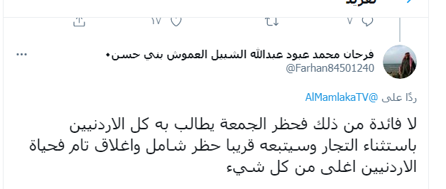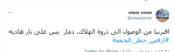 وقال النشطاء عبر "تويتر" إن حظر الجمعة بكل تأكيد يخلف الخسائر ولا فائدة واضحة منهم على المستوى الصحي، مبينين أن اكثر من يخسر من إغلاق الجمعة هم التجار خاصة الصغار منهم.