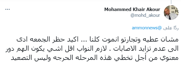 ياسر شطناوي - تفاعل رواد مواقع التواصل الإجتماعي مع كلمة النائب خليل عطية تحت القبة بشان حظر الجمعة والخسائر التي يخلفها على القطاع الخاص.
