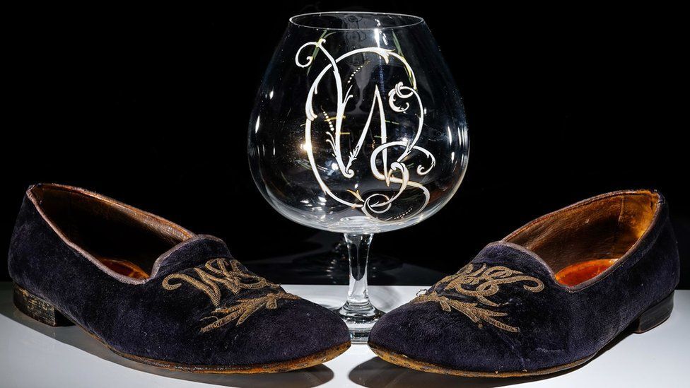 وعرض دار مزادات بيلمانس، الحذاء المخملي الأزرق الذي يعود إلى خمسينات القرن الماضي ويحمل في مقدمته الأحرف الأولى من اسم تشرشل (WSC)، وكوب خاص لشراب البراندي والذي يحمل أيضا أحرف اسم تشرسل مقابل أكثر من 18000 جنيه إسترليني.