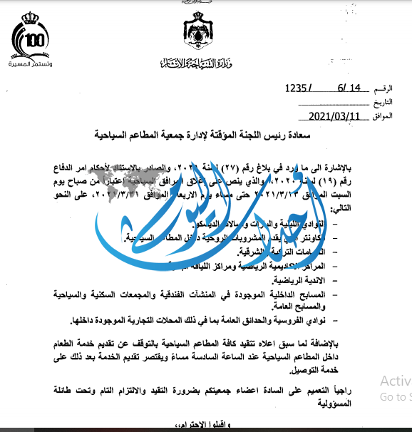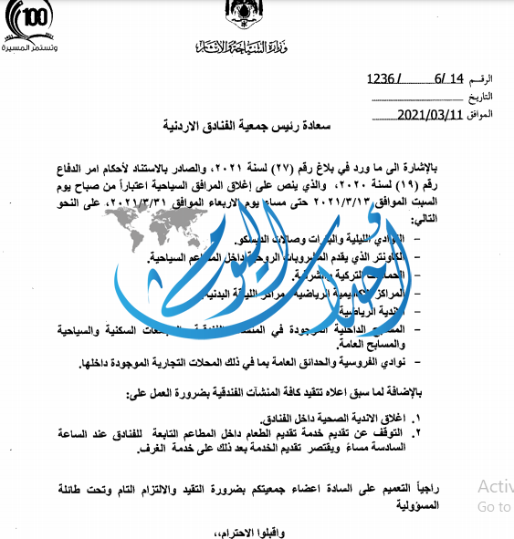 أحداث اليوم - فرح غيث - أصدرت وزارة السياحة اليوم الخميس تعميماً لجمعية الفنادق الأردنية و إدارة جمعية المطاعم تطلب فيه اغلاق المرافق السياحية اعتباراً من صباح يوم السب عملا باحكام امر الدفاع 19.