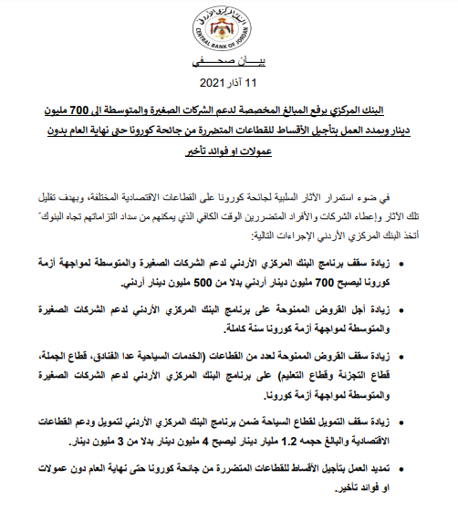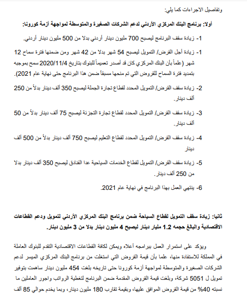 • زيادة أجل القروض الممنوحة على برنامج البنك المركزي الأردني لدعم الشركات الصغيرة والمتوسطة لمواجهة أزمة كورونا سنة كاملة.