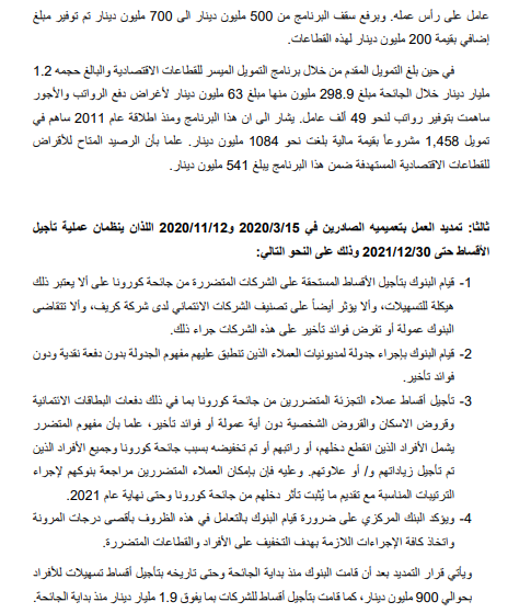 • تمديد العمل بتأجيل الأقساط للقطاعات المتضررة من جائحة كورونا حتى نهاية العام دون عمولات او فوائد تأخير.