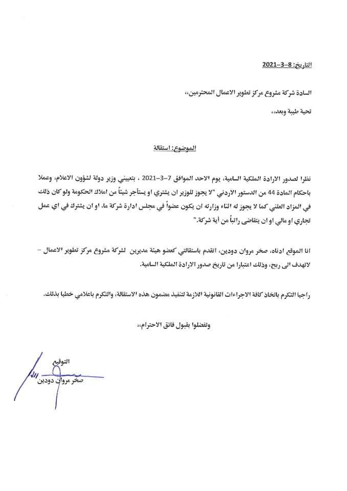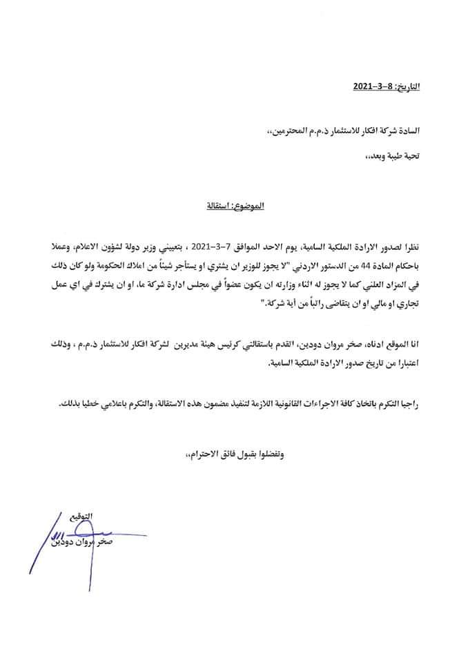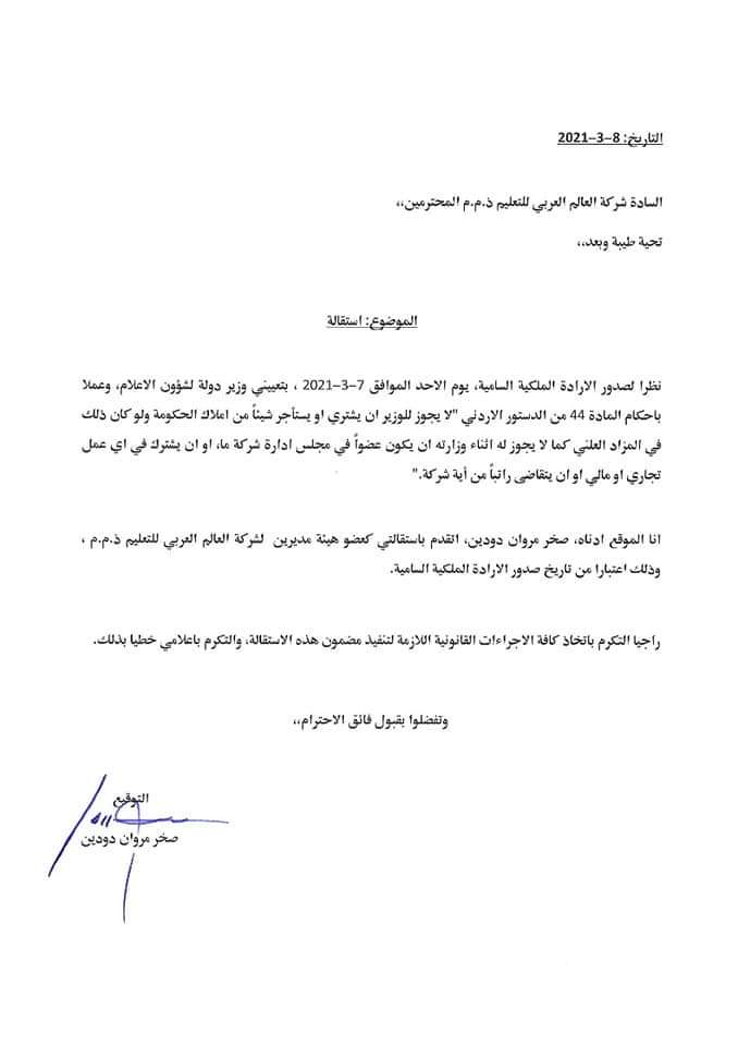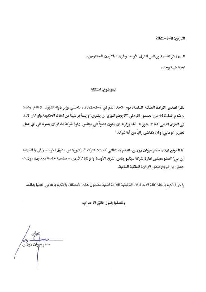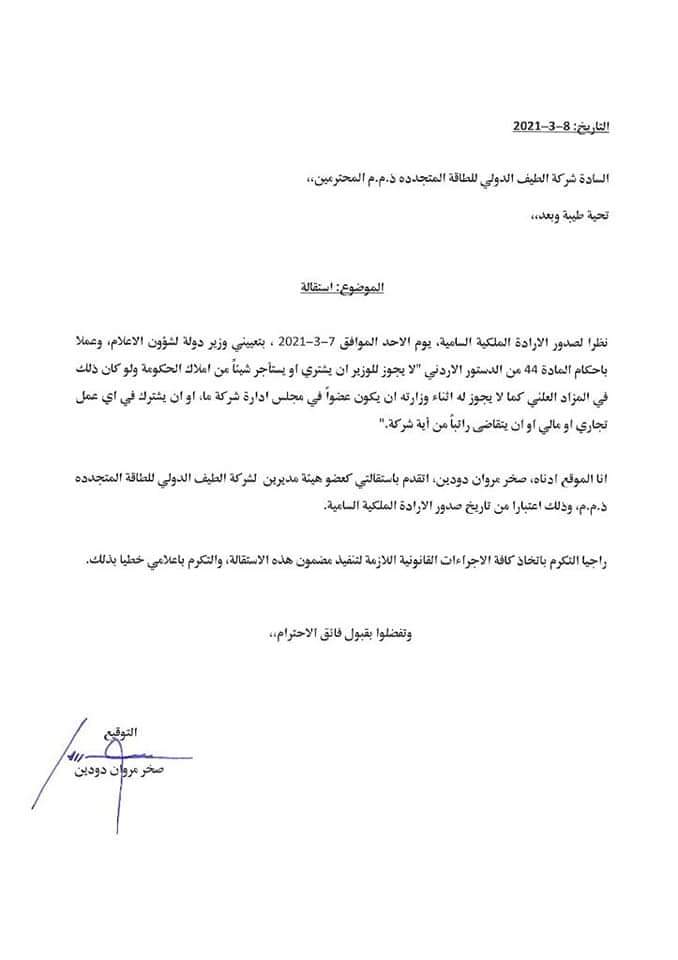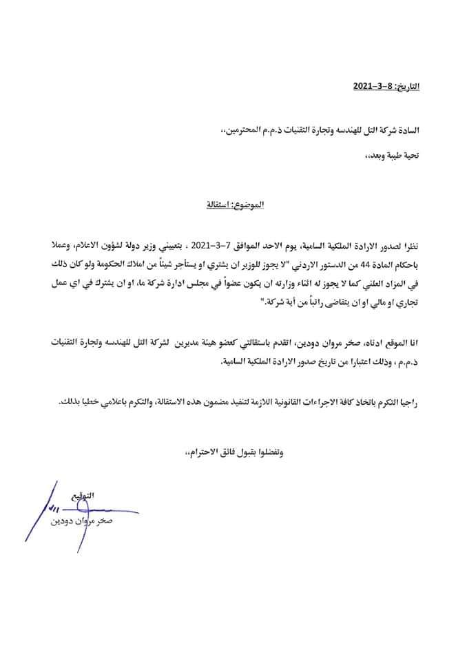 أحداث اليوم - قدم وزير الدولة لشؤون الاعلام الناطق الرسمي باسم الحكومة المهندس صخر دودين استقالته من الشركات التي يشغل عضوية مجلس ادارة بها.