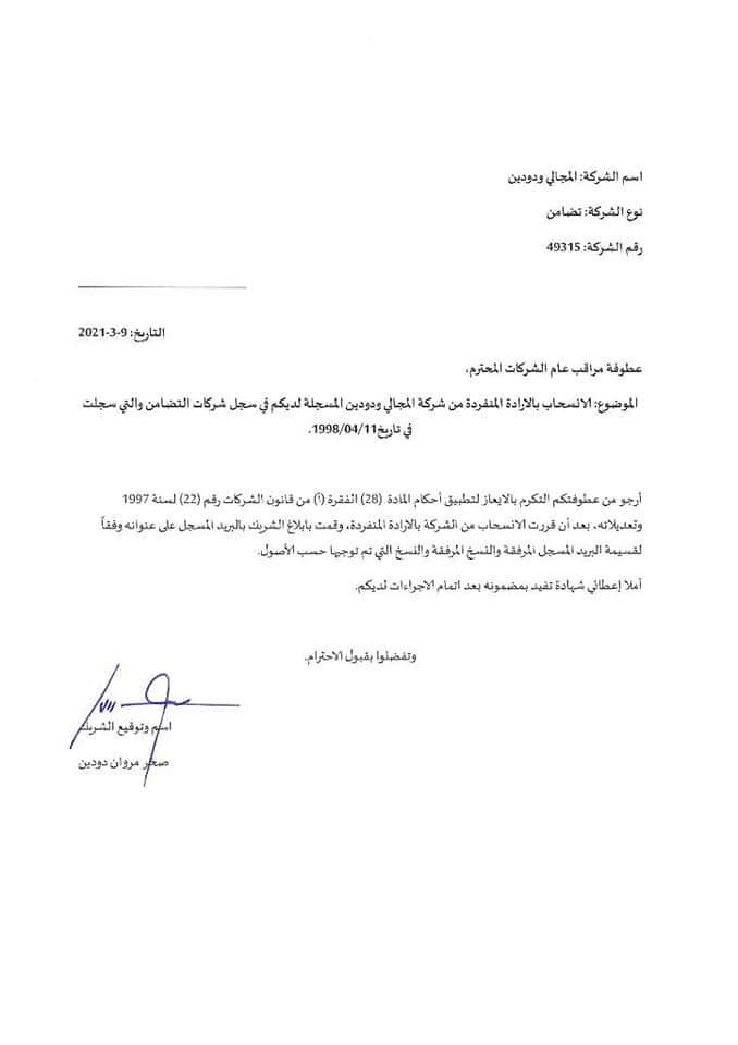 وبين انه تم تبليغ الشركات المذكورة بهذا عبر البريد المسجل حسب أحكام القانون.