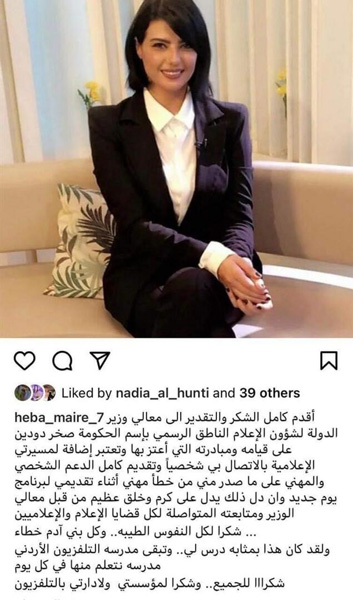 وقالت مرعي عبر "إنستغرام"، إن الوزير دودين قام بالاتصال بها ودعمها بعد صدور خطأ مهني منها أثناء تقديمها البرنامج الصباحي على شاشة التلفزيون الأردني "يوم جديد".