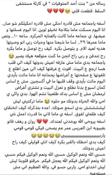 "" اسفه ياجماعه مش قادره احكي مش قادره احكيلكم شو صار.. انا اليوم مسكت ماما بثلاجة تخيلو لوين. انا اليوم غسلتها و عبضها. ي جماعه ماما كانت بالعنايه المركزه. ساعه ١٠.. ونص ماما عمرها ٣٩.. لسا ما شبعنا منها وحيات ربي انو وصيتها هديه لعيد الام. و بتوصل بكره. كيف رح توصل و ماما بكره رح تندفن و ربي راح انجن ما كنت متوقعه هيك يصير