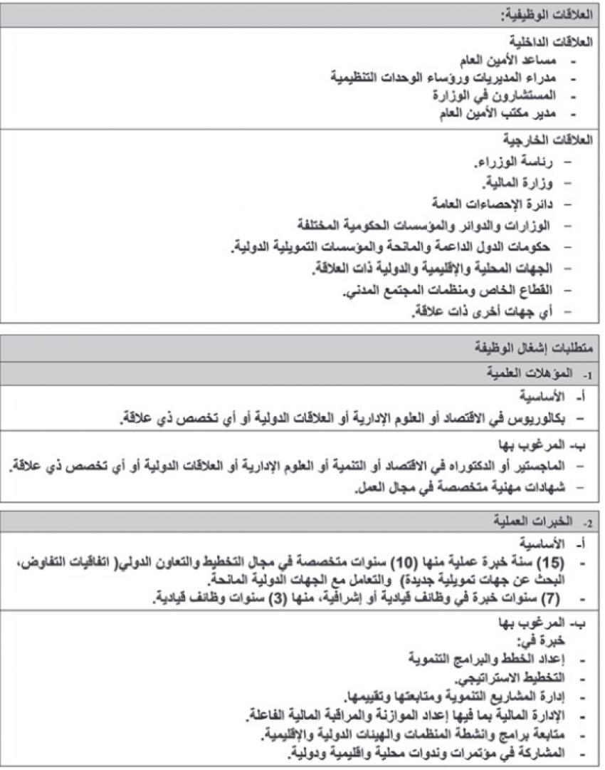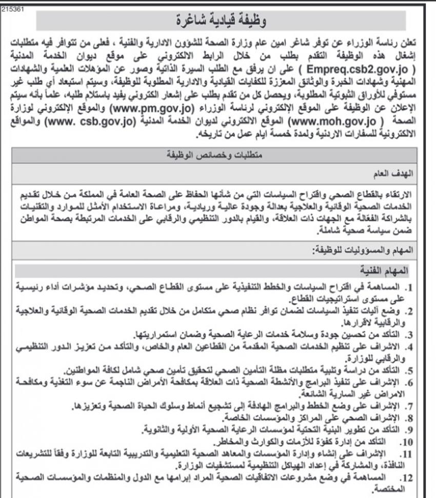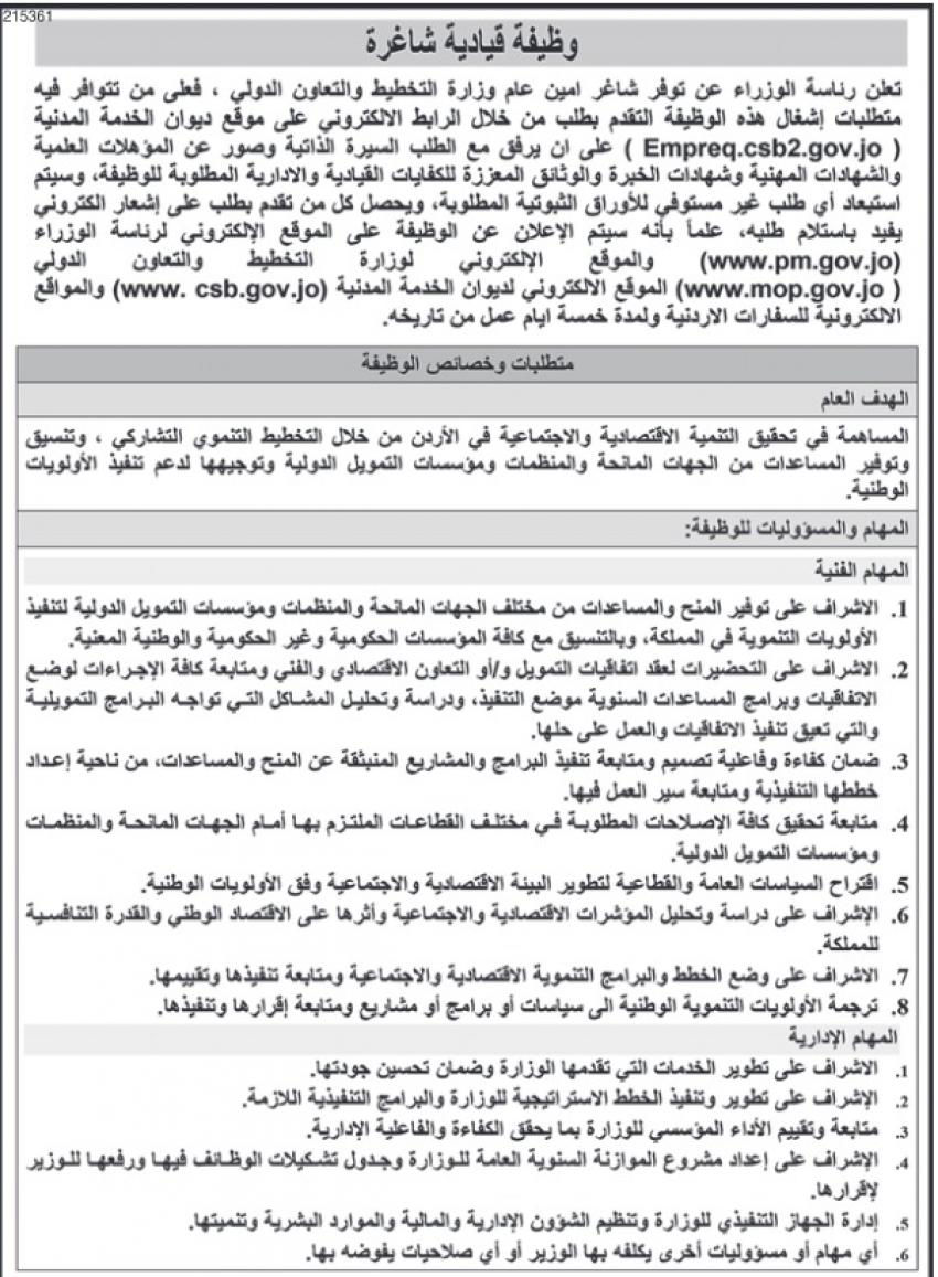 أحداث اليوم - أعلنت رئاسة الوزراء عن وظيفتين قياديتين شاغرتين، هما أمين عام وزارة الصحة للشؤون الادارية والفنية وأمين عام وزارة التخطيط والتعاون الدولي.وتالياً نص الاعلان:
