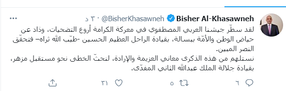وكتب في تغريدة له عبر موقع تويتر إنّ ذلك كان بقيادة الراحل الملك الحسين -طيّب الله ثراه– فتحقّق النصر المبين.