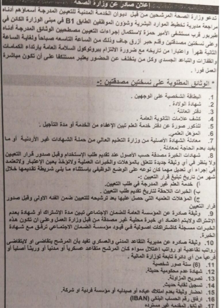 أحداث اليوم - دعت وزارة الصحة عدد من المرشحين من قبل ديوان الخدمة المدنية للتعيين المدرجة أسماؤهم أدناه، مراجعة مديرية تخطيط الموارد البشرية وشؤون الموظفين في مبنى الوزارة.