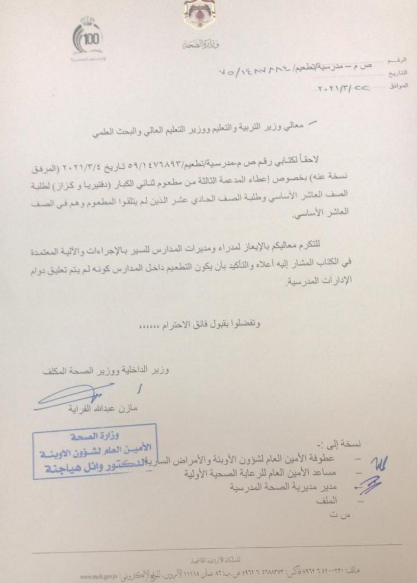 أحداث اليوم - طلب وزير الداخلية ووزير الصحة المكلف مازن الفراية من وزير التربية والتعليم الايعاز لمدراء ومديرات المدارس للسير بالاجراءات والآلية المعتمدة للتأكيد بأن يكون التطعيم للطلبة داخل المدارس كونه لم يتم تعليق دوام الادارات المدرسية.
