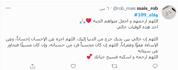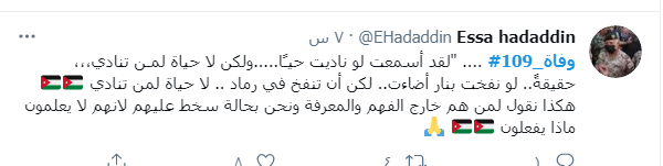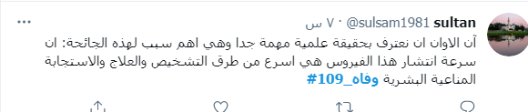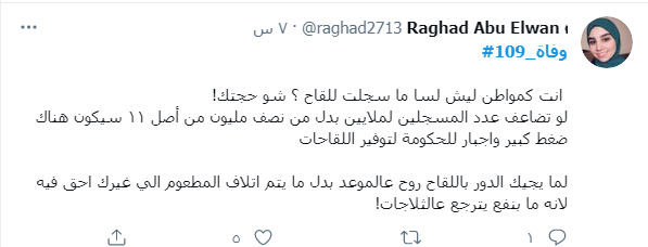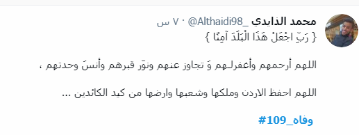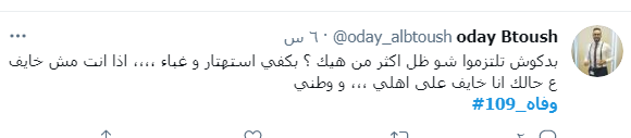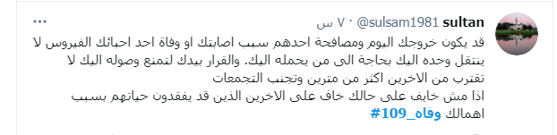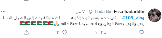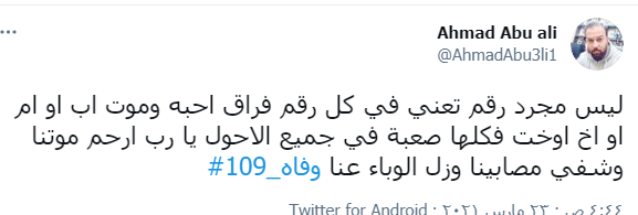 ودشن النشطاء وسم #109_وفاه، ليتصدر قائمة الترند، مشيرن من خلاله إلى أن الأردن اليوم فقد 109 من الأحباء نتيجة الفيروس واصرار البعض على عدم الالتزام واتباع التعليمات والتدابير الصحية.