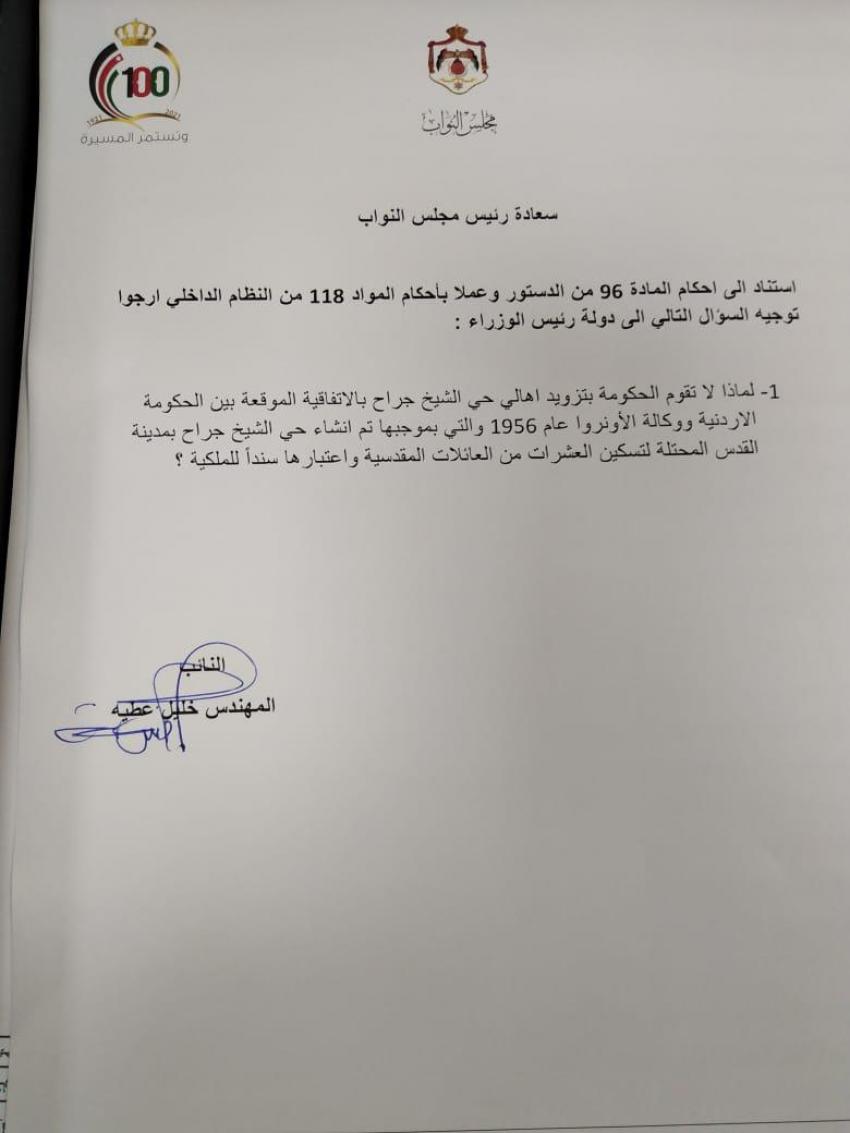 وطلب عطية من الحكومة تزويده بالاتفاقية الموقعة بين الحكومة الاردنية ووكالة الأونروا عام 1956 والذي بموجبه تم انشاء حي الشيخ جراح بمدينة القدس المحتلة لتسكين العشرات من العائلات المقدسية؟