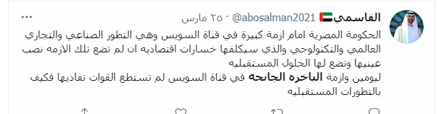 ودشن النشطاء عبر مواقع التواصل الإجتماعي وسم "#الباخرة_الجانحة" معبرين من خلاله عن أسفهم على هذا الحادث، وما خلف من خسائر كبيرة في التجارة العالمية البحرية.