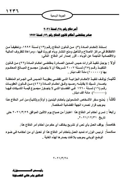 أحداث اليوم - نشرت رئاسة الوزراء في الجريدة الرسمية ، النص الكامل لأمر الدّفاع رقم (28) لسنة 2021م، الذي يتيح استمرار إجراءات التقاضي، وطلب تثبيت الحقوق بين الدائن والمدين، دون تنفيذ إجراءات الحبس بحقّ المدين، حتّى تاريخ 31/12/2021م، مع التأكيد على منع المدين من السفر لحين قضاء الدّين.
