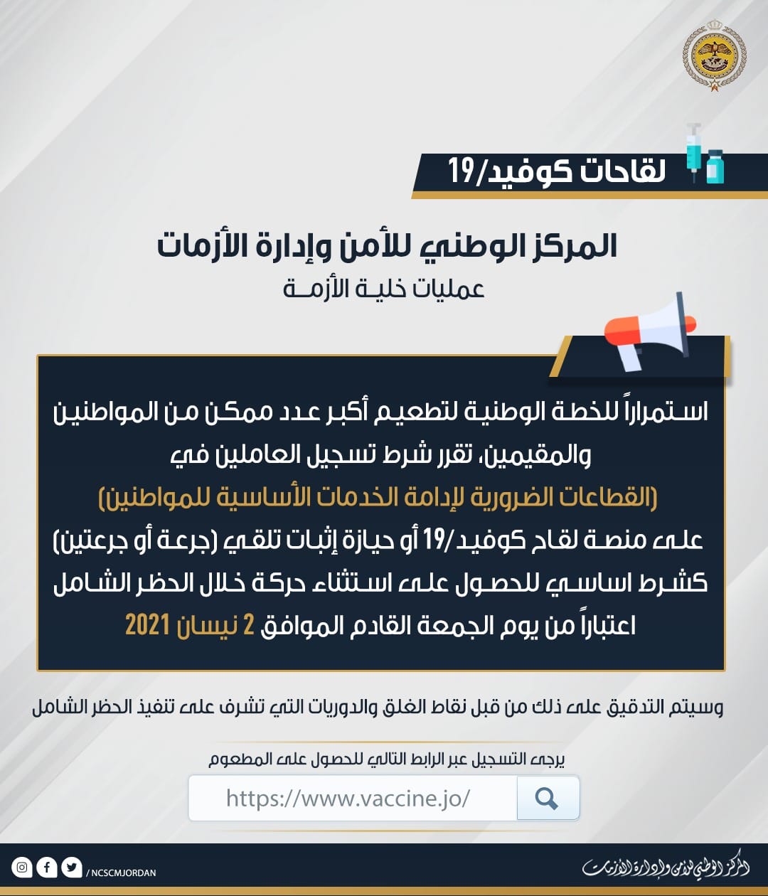 أحداث اليوم - قال المركز الوطني للأمن وإدارة الأزمات، الإثنين، إنه تقرر اشتراط تسجيل العاملين في القطاعات الضرورية لإدامة الخدمات الأساسية للمواطنين، على منصة لقاح كوفيد-19، أو حيازة إثبات تلقي جرعة أو جرعتين، كشرط أساسي للحصول على استثناء حركة خلال الحظر الشامل، اعتبارا من يوم الجمعة القادم الموافق 2 نيسان