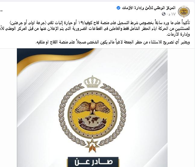 وأوضح المركز أن ما ورد بخصوص شرط التسجيل على منصة لقاح كوفيد19 أو حيازة إثبات تلقي (جرعة اولى أو جرعتين) للمستثنيين من الحركة فقط والعاملين في القطاعات الضرورية التي يتم الإعلان عنها من قبل المركز الوطني للأمن وإدارة الأزمات.