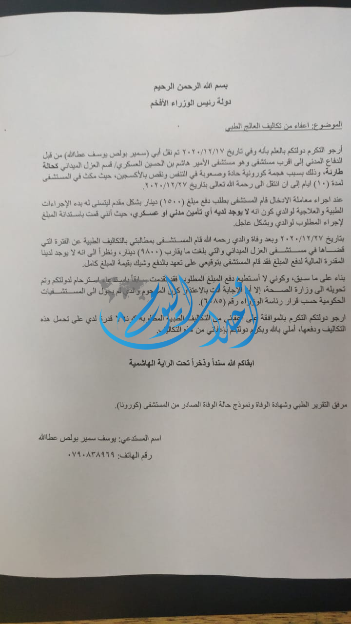 أحداث اليوم - رصد - طالبت عائلة سمير بولص عطاالله، أحد المتوفين بفيروس كورونا المستجد في مستشفى الأمير هاشم بن الحسين في محافظة الزرقاء، بإعفائه من المبلغ المترتب على العلاج كونهم غير قادرين على تحمله والذي وصل إلى 9800 دينار.