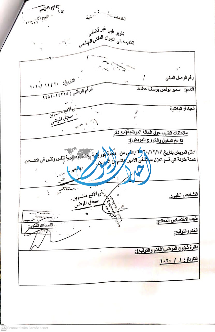 وبيّن نجله بأنه قام بمخاطبة وزارة الصحة حيث ردت بأنه لم يتم تحويله من أحد المستشفيات الحكومية، كما قام بمخاطبة الديوان الملكي إلا أنه ولورود خطأ في الإجراءات من قبله قام الديوان بصرف 500 دينار فقط فيما تعذر اتخاذ إجراء آخر من قبل الديوان على نفس المعاملة.