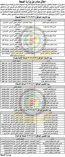 أحداث اليوم - اعلن ديوان الخدمة المدنية، اليوم الثلاثاء، أسماء المدعوين لاجراء المقابلات الشخصية في وزارة الصحة.وأكد ديوان الخدمة على أهمية الحضور مع الالتزام بالبروتوكول الصحي وارتداء الكمامة والتباعد الاجتماعي.